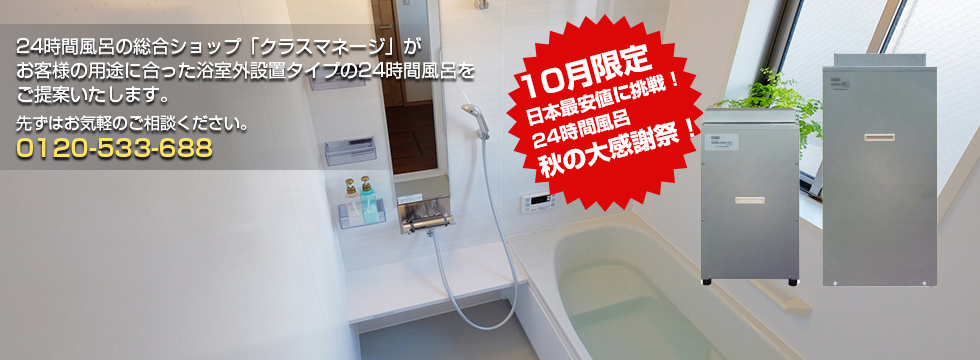 2世帯住宅、ご利用人数の多いご家庭、浴槽の水量が多く大きいご家庭、ホテル・旅館、施設などの大浴場、ペンション・民宿・寮などの浴槽におすすめの浴室外設置(外付け・業務用)タイプ。