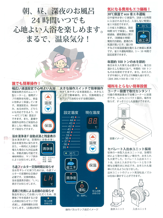 | 【浄化システム】 | トップフィルター・ろ過フィルター・浴水清浄液F、(浄化タブレット) |